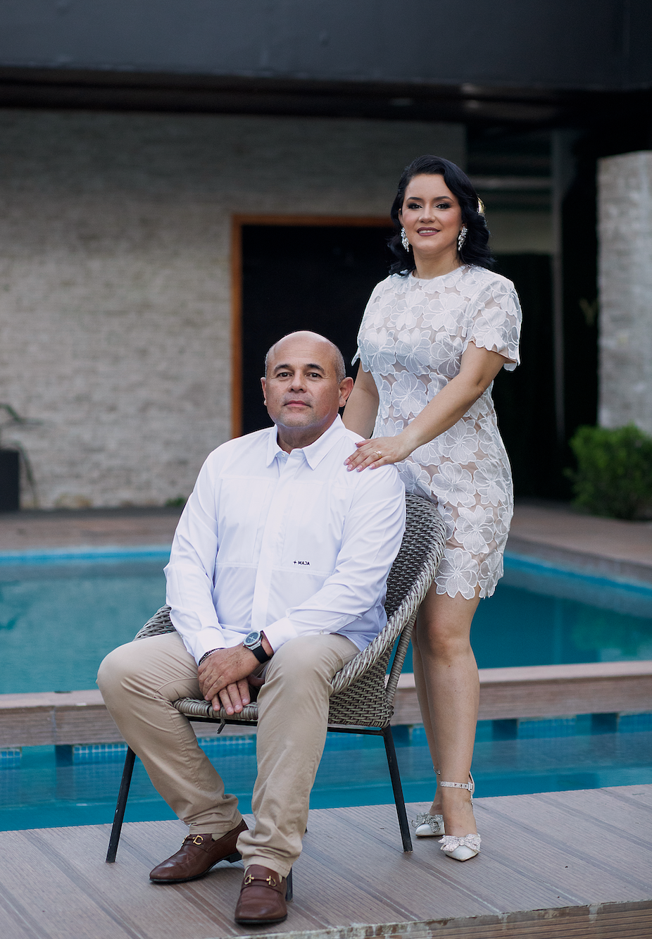 Pantalón azul marino, guayabera beige o blanca.